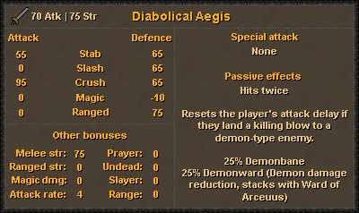 The Diabolical Aegis is a new two-handed weapon designed to fill the Demonbane Crush gap. We’re looking at 4 Attack Speed, double hitsplats, and a passive effect which resets your attack delay if you land the killing blow on a demonic enemy.