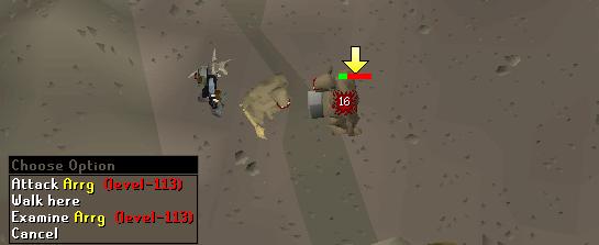 Note: In the arena there is a safe spot where Arrg can't attack you with either ranged or melee. To access the safe spot walk north up the eastern wall.